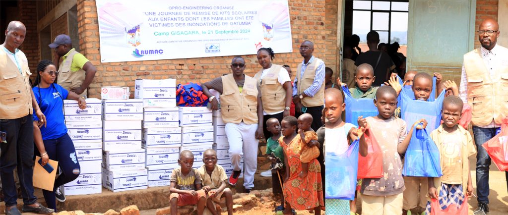 Considérant que l’éducation des enfants est l’une des préoccupations majeures des familles victimes des naufrages dues à la montée des eaux du lac TANGANYIKA à Gatumba, OPRO-Engineering dont l’un de ses axes d’intervention figure la promotion des bonnes pratiques de la sauvegarde sociale et environnementale, en collaboration avec le Ministère de la solidarité national, des affaires sociales, des droits de la personne humaine et du Genre à travers le DPDFS Bujumbura, a offert une assistance composée de kits scolaires aux élèves dont les familles ont été victimes de ces catastrophes.